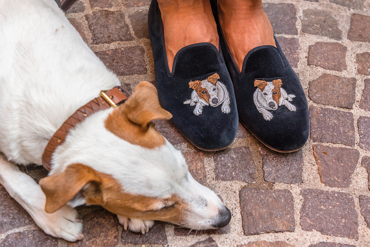 - La collection Alexander Kraft Monte Carlo propose aussi tout un choix de pulls col roulé en cachemire, de pantalons casual. Et même des Albert slippers, dont ce modèle relevé du portrait brodé de Bertie, le chien d’Alexander.