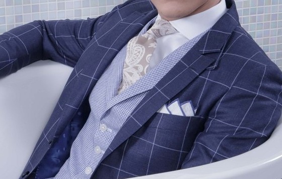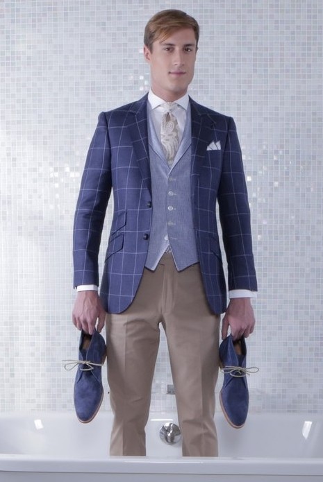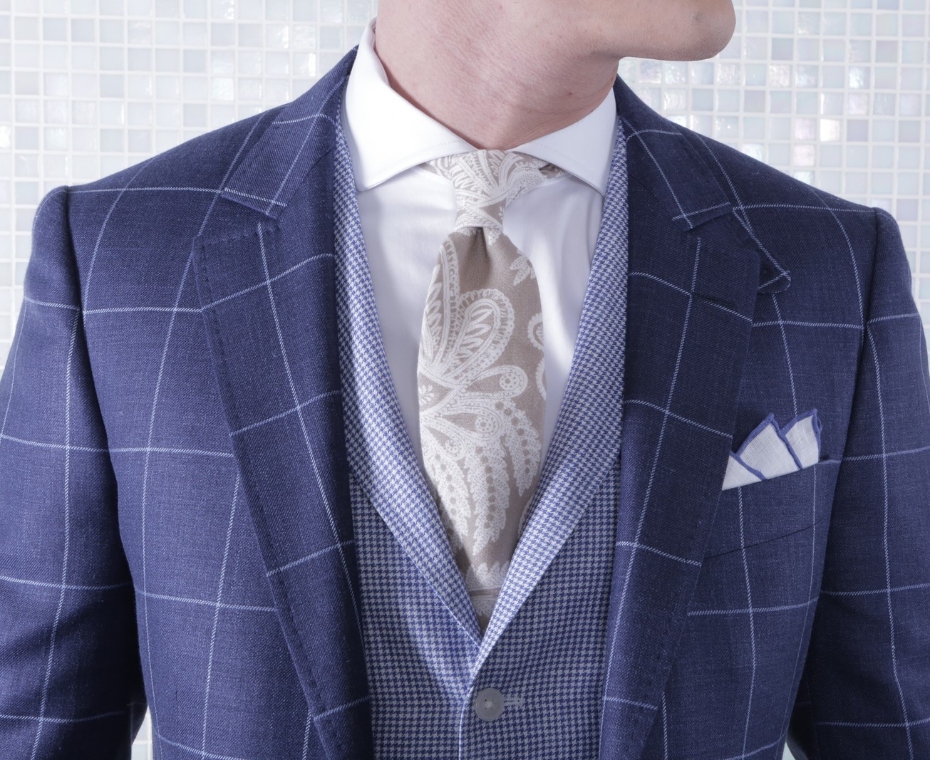 Veste Kensington à carreaux, 2 boutons, coupe anglaise cintrée, véritables boutonnières aux manches. Laine, lin et soie. Pantalon en gabardine de coton, side adjusters à la ceinture. Gilet à revers en lin à motifs pied de poule. Chemise blanche, en coton double retors, col italien et poignets mousquetaires. Cravate à motifs Paisley en coton. Mouchoir en lin blanc bordé de bleu. Chukka Boots Matthew Cookson.