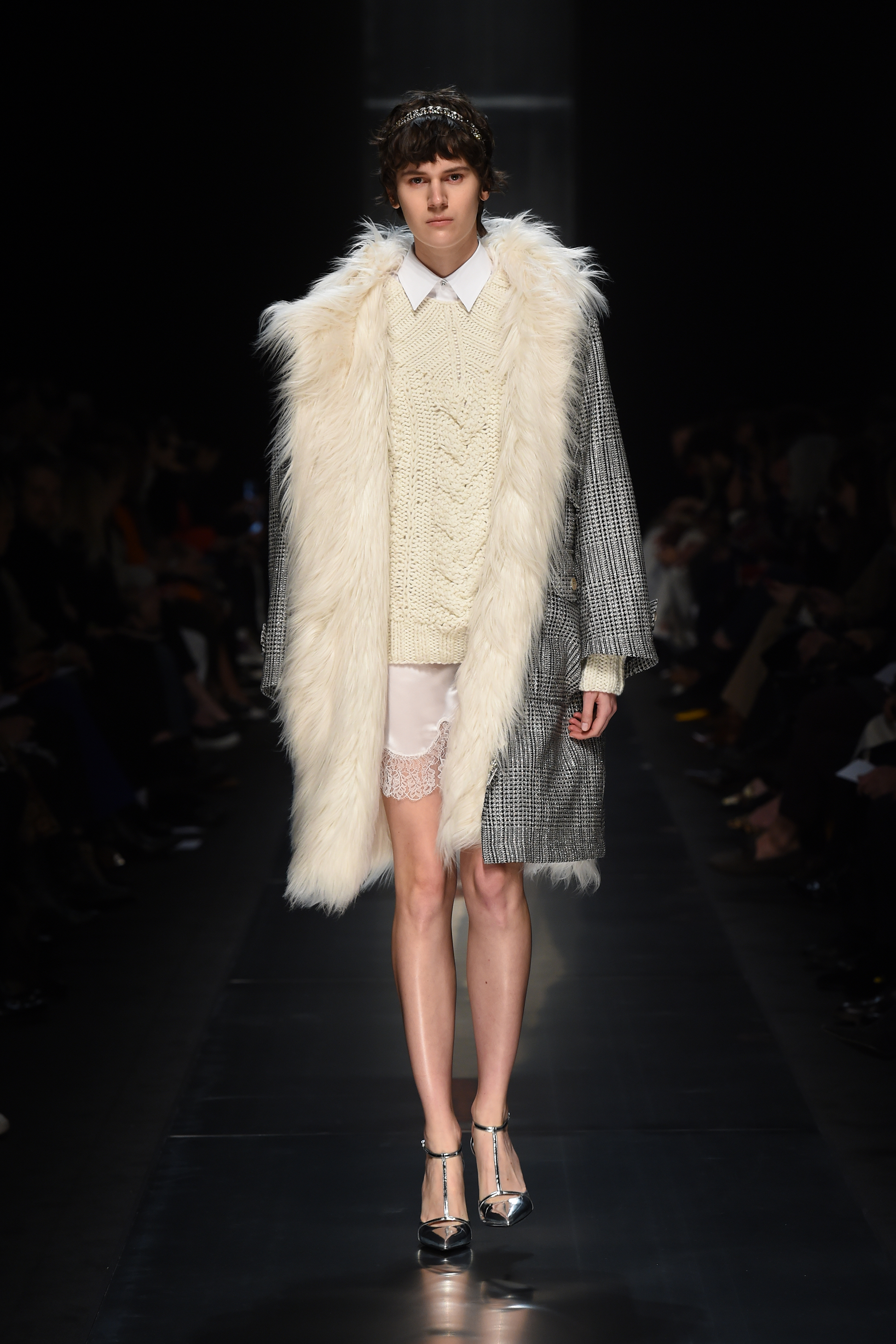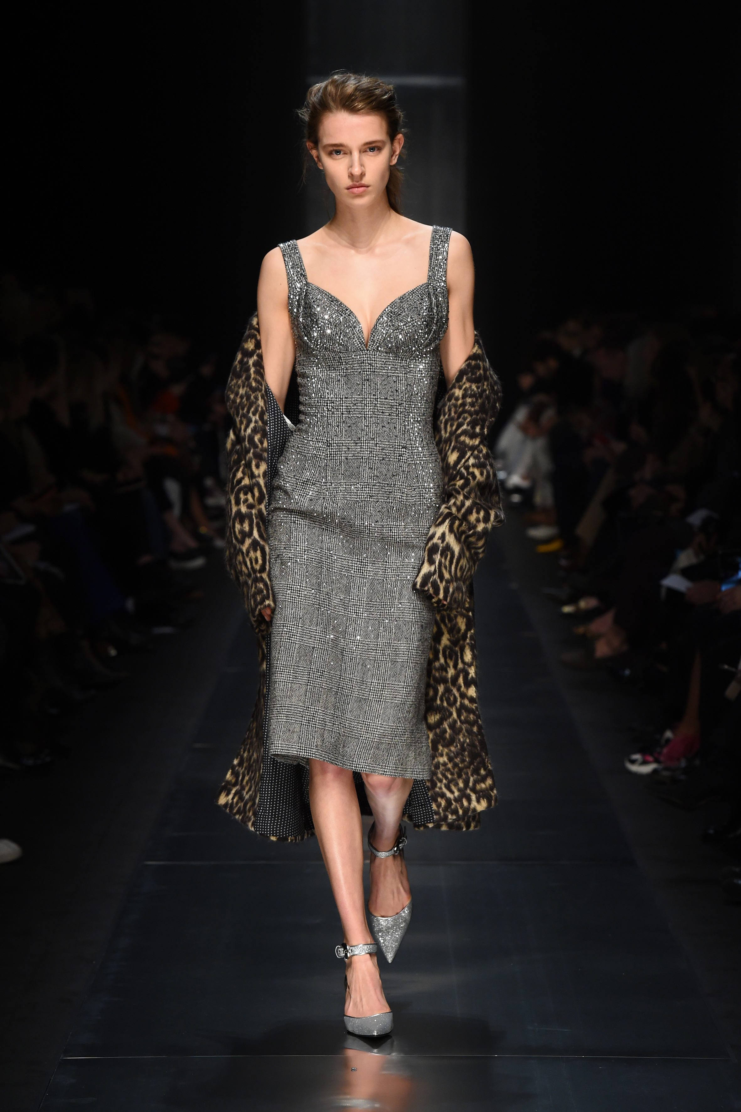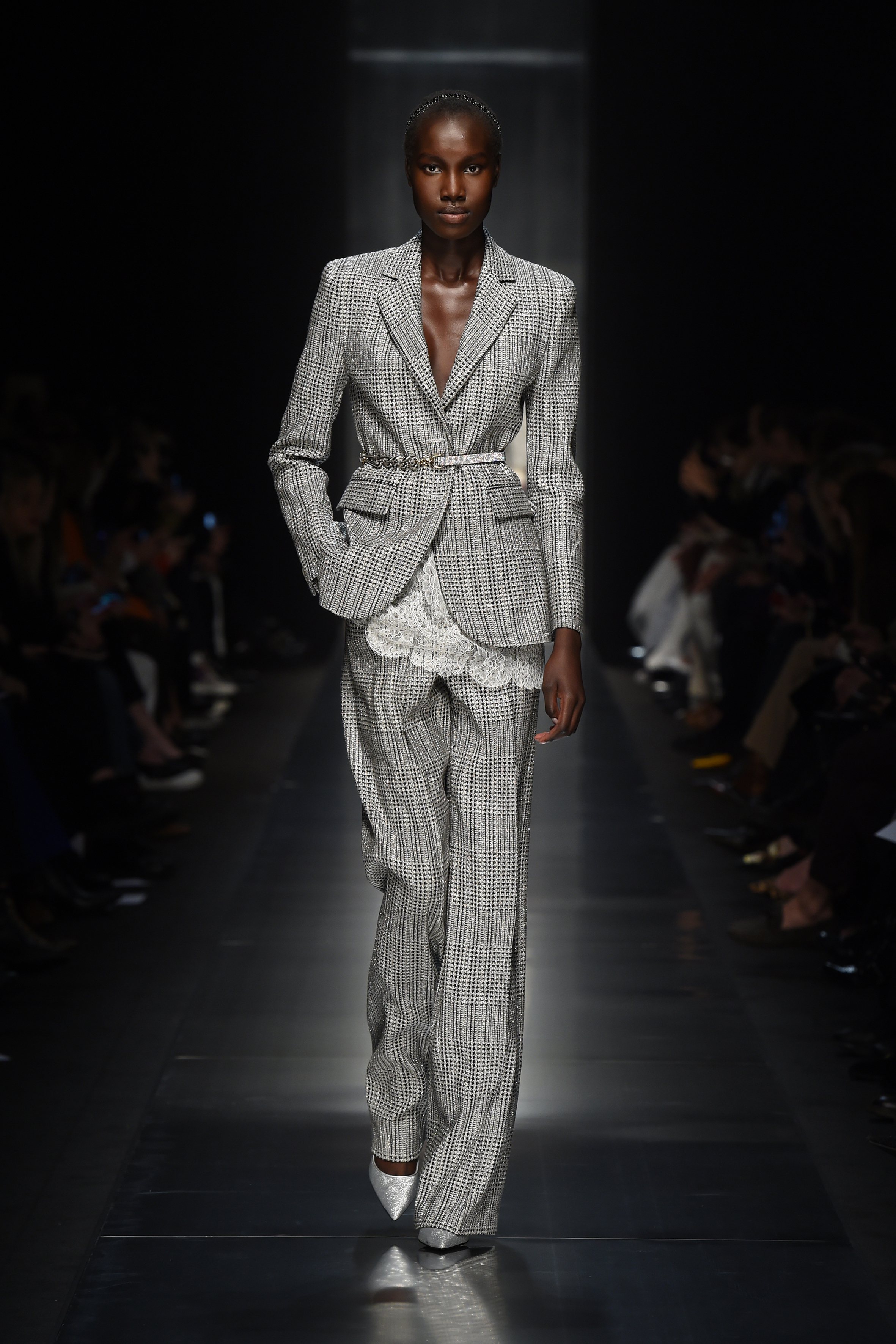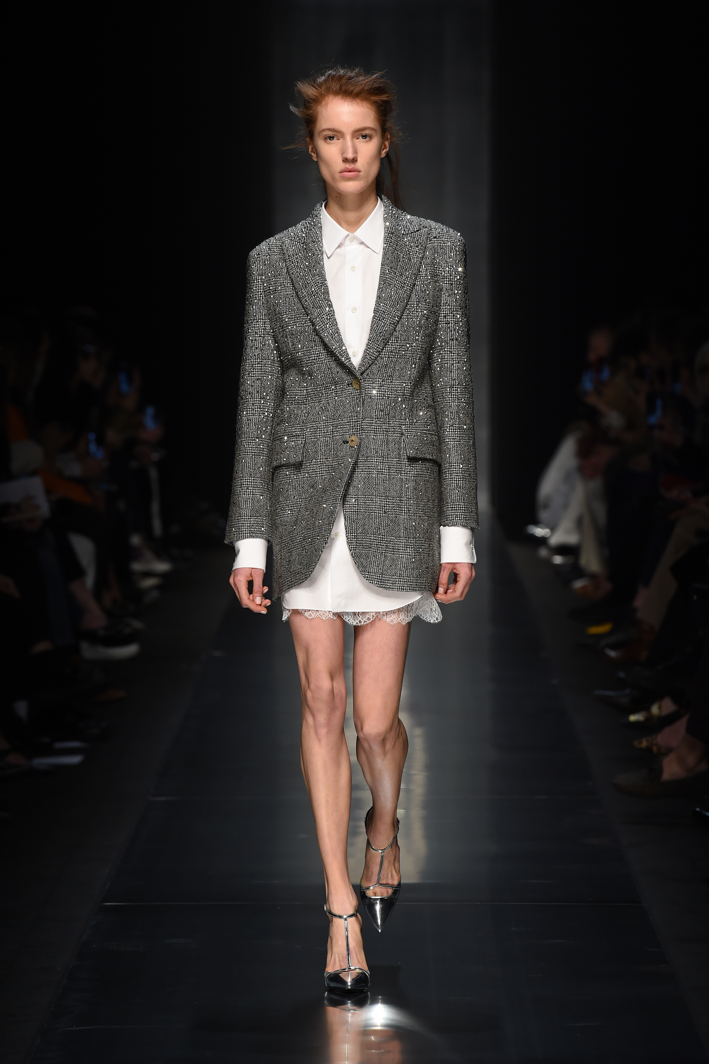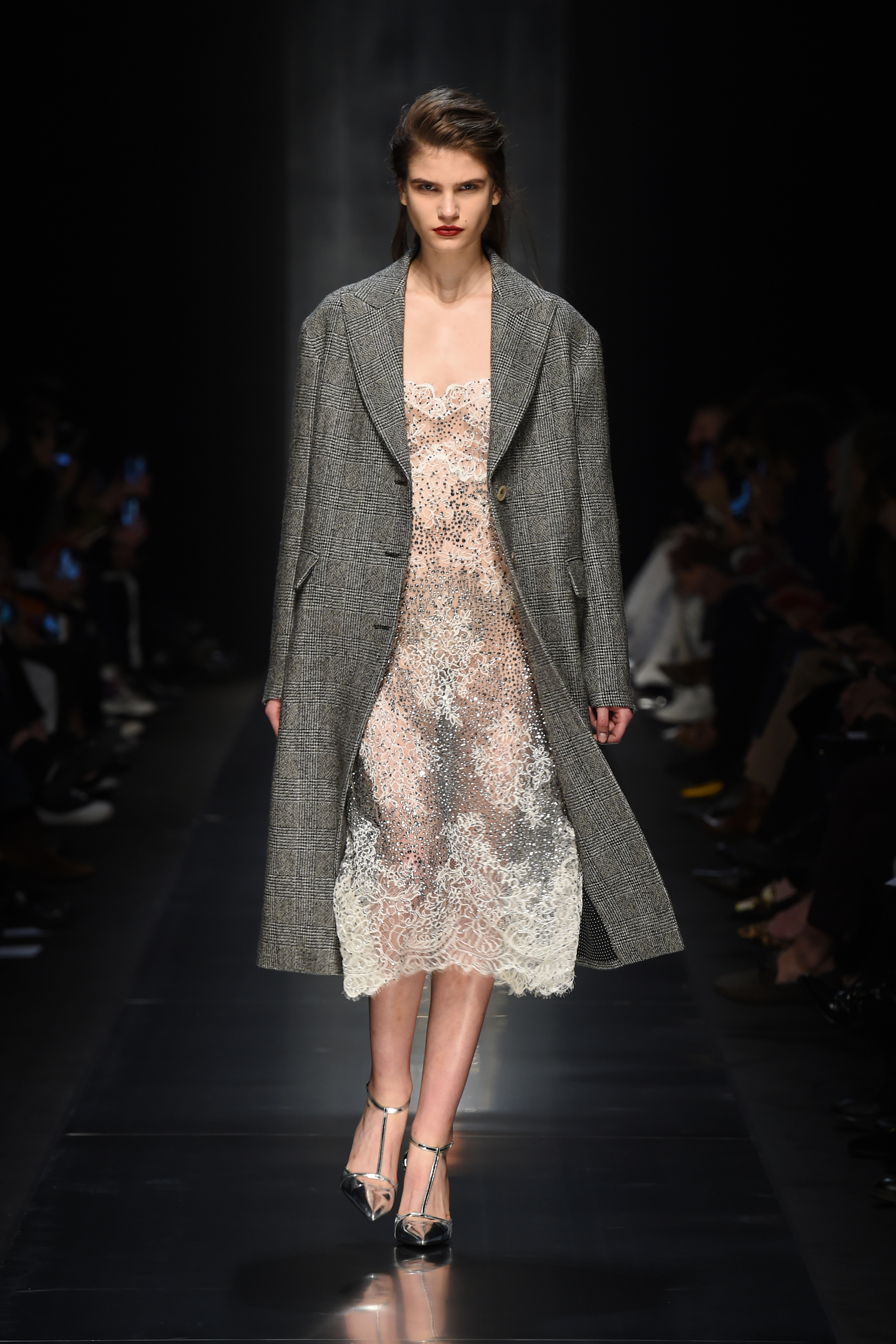 Des sources lumineuses inattendues et des combinaisons contrastées de volumes et de matériaux sont les caractéristiques de la femme glamour Ermanno Scervino dans son expression la plus contemporaine. Les cristaux créent des motifs étincelants sur les tricots ou sur les tissus masculins comme les rayures, le Prince de Galles et les pieds de poule. Des clous bijou sur les vestes et les robes en dentelle, tandis que des appliques pailletées créent une nouvelle définition de la lingerie de jour. Les smokings super féminins en dentelle ultra-douce ont un motif ton sur ton dessiné en cristaux.