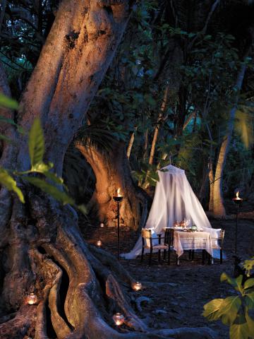 L’ambiance est certes plus Out of Africa qu’eau bleue et plage dorée, mais l’atmosphère inoubliable. Inévitablement plus succinct qu’en salles, le menu n’en reste pas moins délicieux, crustacés, poissons et viandes étant cuits sous nos yeux au feu de bois. Une infime réserve pour le service cependant, moins pointilleux que dans les restaurants : mieux vaut ne pas vouloir un condiment rare une fois installé… Un détail que l’on oublie d’autant plus facilement que l’authenticité du cadre incite à l’indulgence sur la question. Les amateurs de personnalisation ne voulant pas renoncer à un confort de palace ont toujours la possibilité de commander un dîner sur leur terrasse, sur la plage ou sur le voilier de l’hôtel.