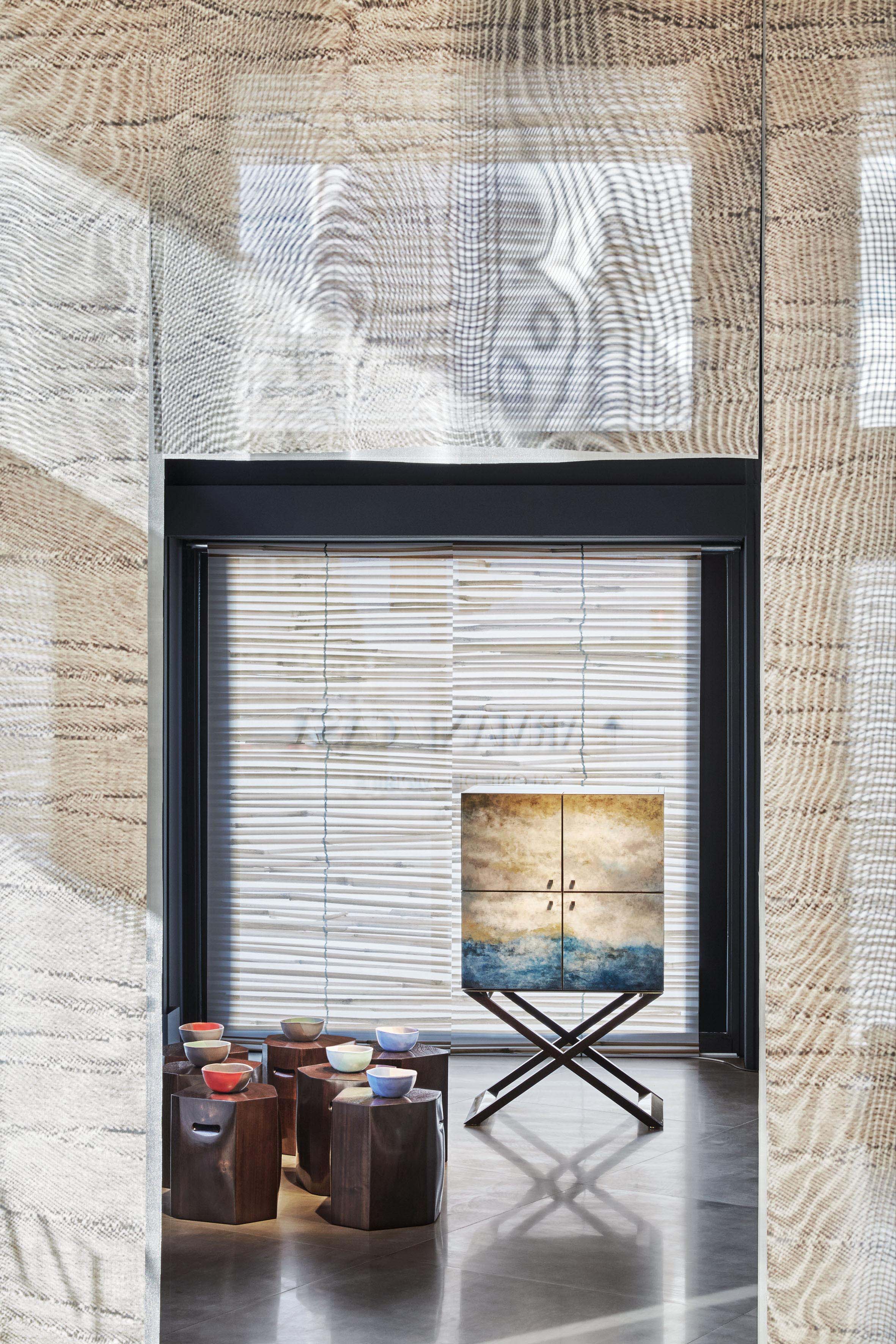 Le mobilier comme architecture. Le minimalisme, la simplicité et la pureté de la ligne attirent l’attention sur la qualité des matériaux et sur l’élégante réduction de l’épaisseur, soulignées par de nouvelles finitions. La texture devient un hymne à la matière, telle que la laque vernie de l’Himalaya avec sa texture géométrique, en contraste avec la texture naturelle du raphia, la laque métallique liquide argentée qui met en relief le grain du bois, la laque métallique liquide avec des gravures en laiton et la laque métallique liquide en or blanc.