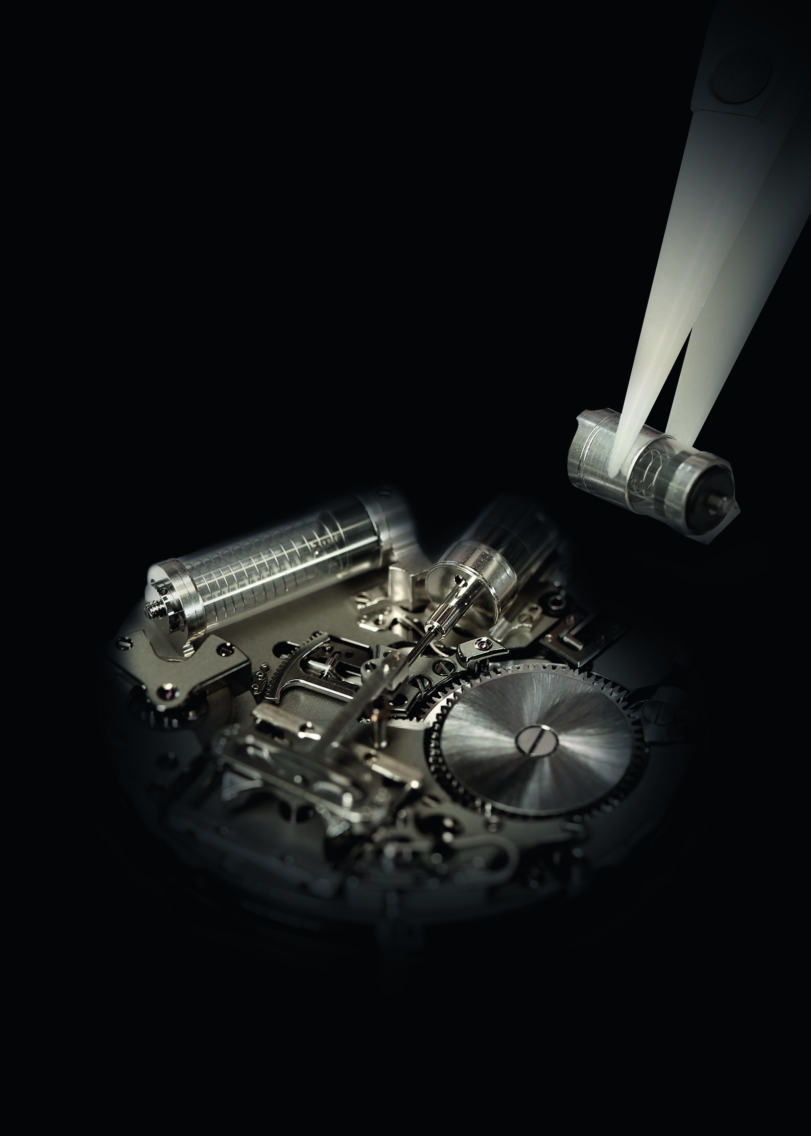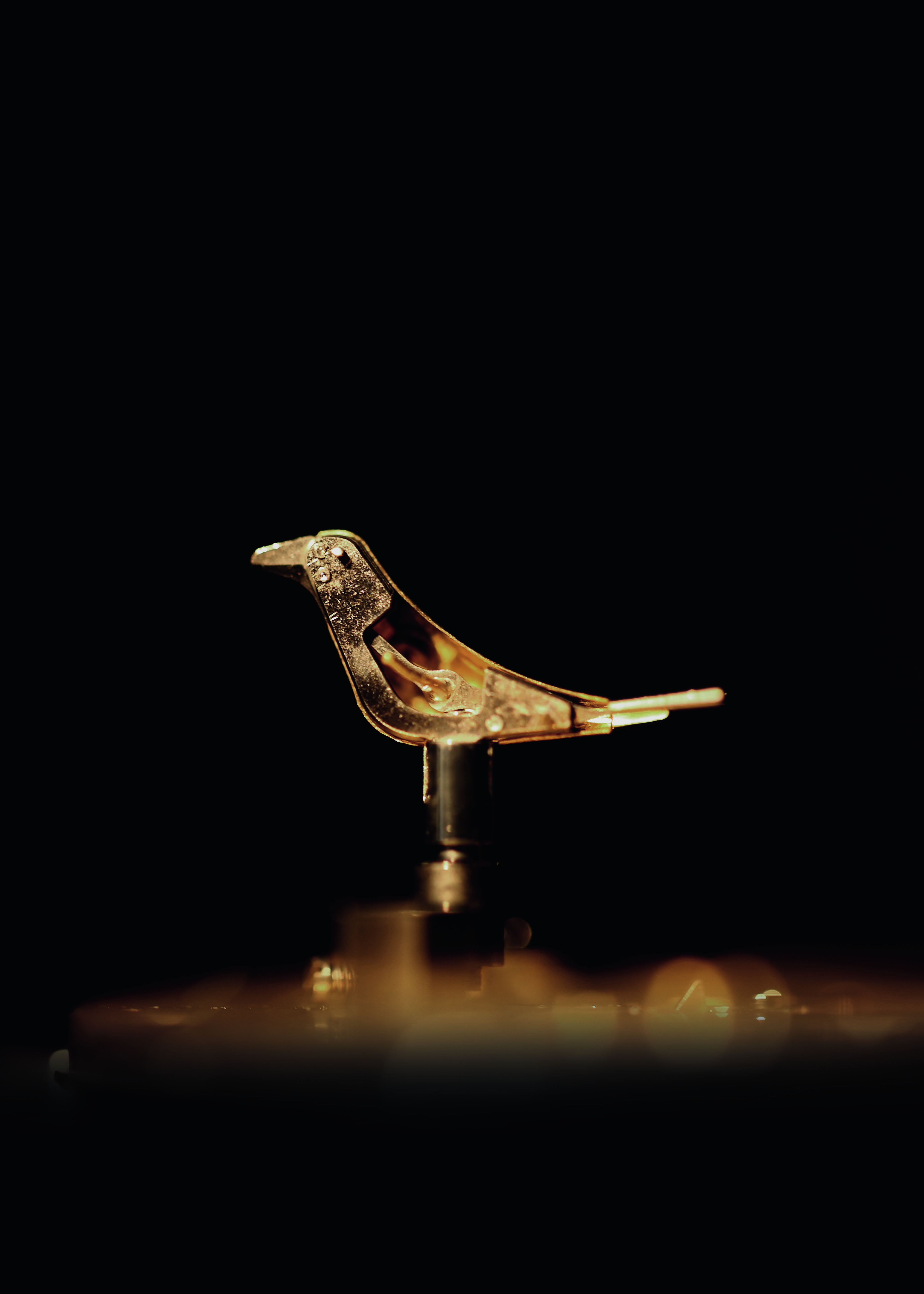 Celle-ci, pour la première fois de l’histoire dans un garde-temps de poignet, s’exprime par compression d’air au sein de trois tubes en verre saphir, compression relâchée par intermittences à travers un sifflet pour produire une ritournelle parfaitement fluide sur laquelle l’oiseau s’anime. Ce dernier témoigne de l’héritage de Pierre Jaquet-Droz qui, il y a près de trois siècles, en avait choisi la figure pour ses compositions naturalistes, notamment au sein de tabatières et de cages à oiseaux.