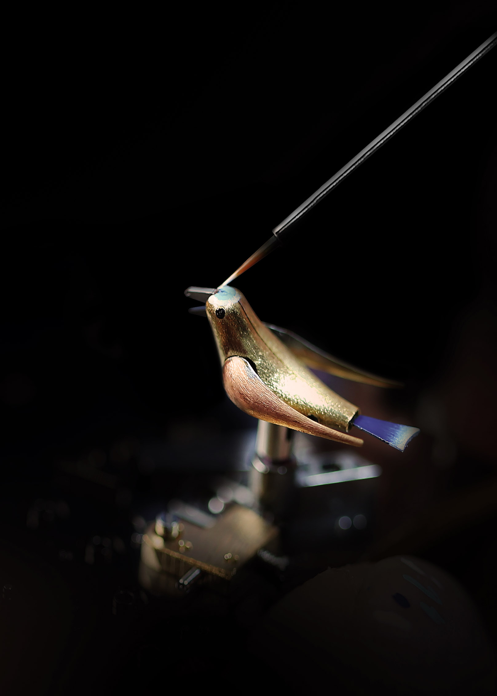 Pure exception mécanique ayant exigé plusieurs années de développement couronnées de deux brevets, la Charming Bird écrit un nouveau chapitre de l’histoire de l’Art de l’Emerveillement commencée par Pierre Jaquet Droz il y a 280 ans. Combinant son génie horloger et mécanique, la pièce perpétue la fascination de ses célèbres automates en la portant au poignet. C’est cette extrême miniaturisation qui a exigé le plus de recherches de la part de Jaquet Droz.