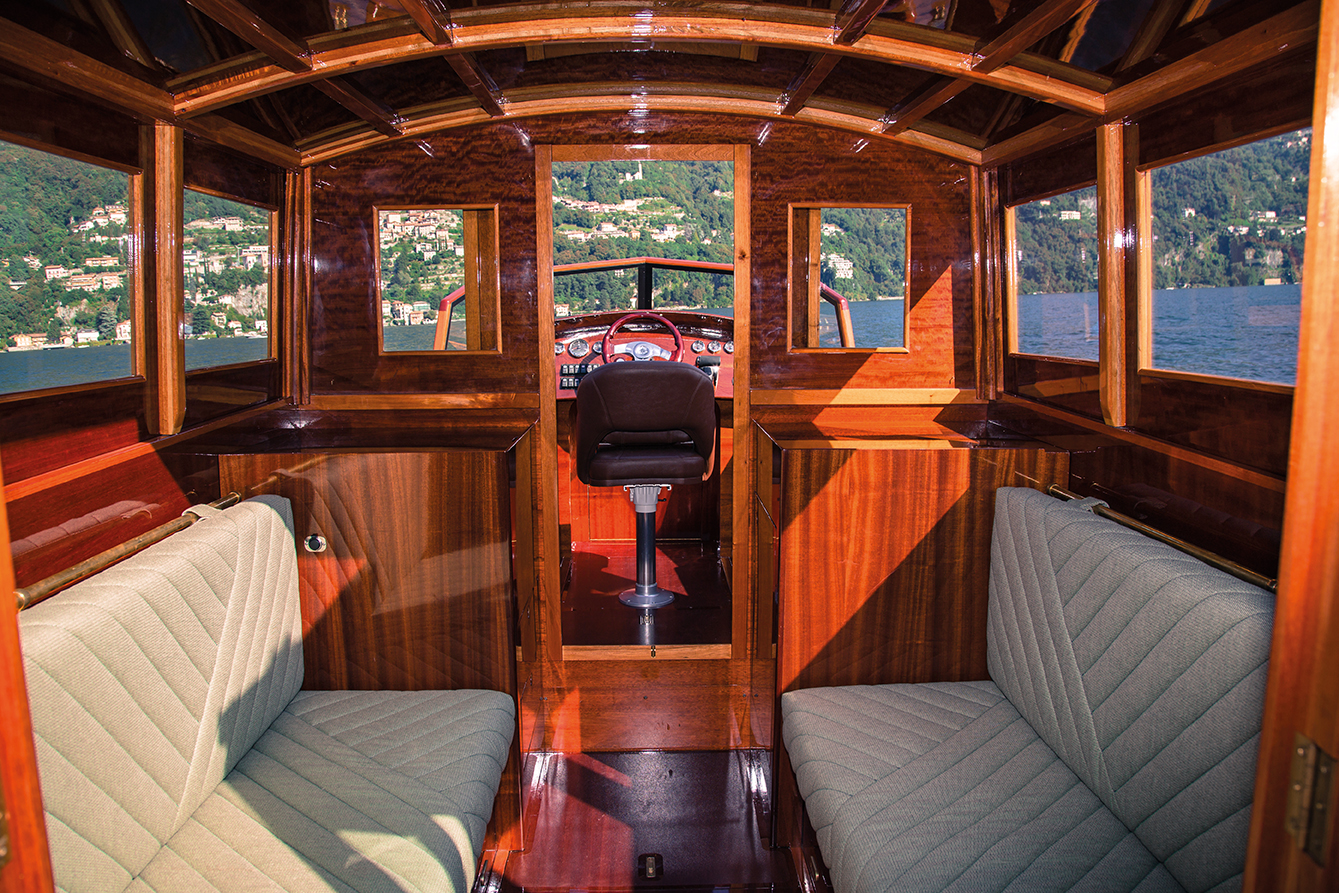 En haut : les petits canots Ernesto Riva mis à la disposition des clients de l’hôtel pour sillonner le lac, l’intérieur de la navette, la terrasse du restaurant. En bas : une chambre Darsena et une table pour deux dans le décor idyllique du restaurant.