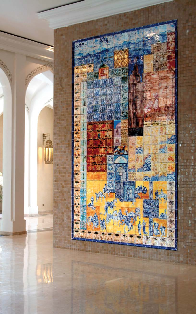 Une démarche qui permet aux clients de profiter de leur séjour pour découvrir les multiples facettes de l’art marocain en cheminant à travers les époques et les influences artistiques. Un voyage qui commence dès le lobby avec les oeuvres du céramiste Kamal Lahbabi – L’arrivée du poète Saadi à Marrakech, Les cinq sens et le sixième, Les lions de l’Atlas… – et la fresque épique longue de onze mètres qui décore la coupole de 17 mètres de haut qui accueille les visiteurs, et qui se poursuit dans les larges couloirs au hasard desquels pas moins de 400 tableaux et sculptures sont exposés. Une collection très éclectique oscillant sans cesse entre le traditionnel et le contemporain dans une vibrante féérie de couleurs et de styles qui constitue une sorte de panorama kaléidoscopique de la peinture marocaine. Privilégiés, les occupants des suites bénéficient de leur petite exposition personnelle, chacune d’entre elles étant consacrée à un artiste.