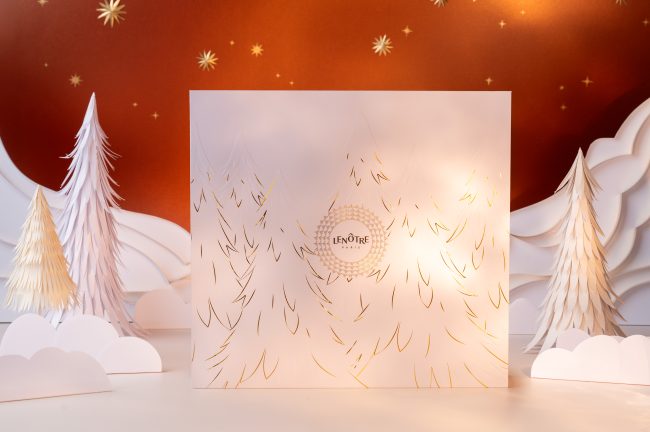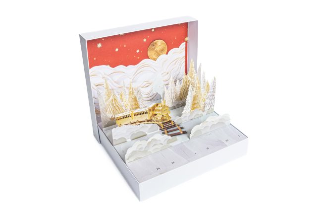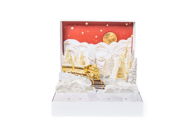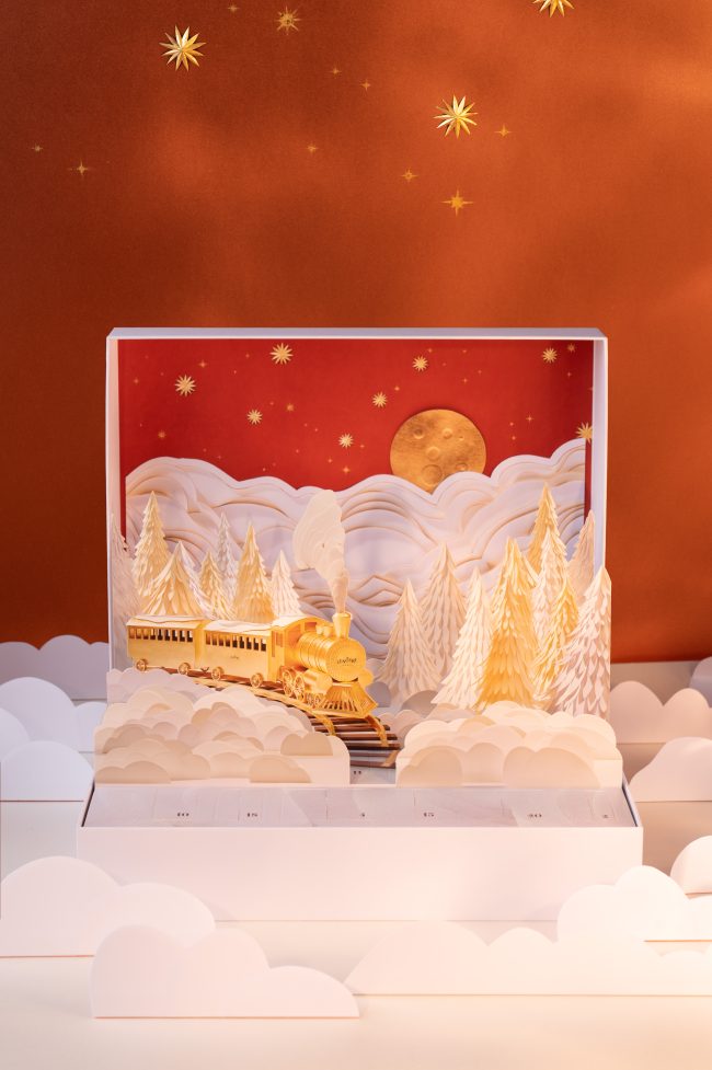 Imaginé comme une œuvre de papier par le studio Marianne Guély, ce calendrier de l’Avent incarne toute la magie d’un Noël signé Lenôtre. Dans un décor hivernal sculpté de sapins blancs et dorés, sous un ciel étoilé et une lune d’or, un train lumineux serpente entre les montagnes enneigées. Chaque fenêtre dissimule une escale sucrée : bonbons de chocolat au lait et noir aux pralinés fondants, mêlant recettes iconiques et créations inédites.
