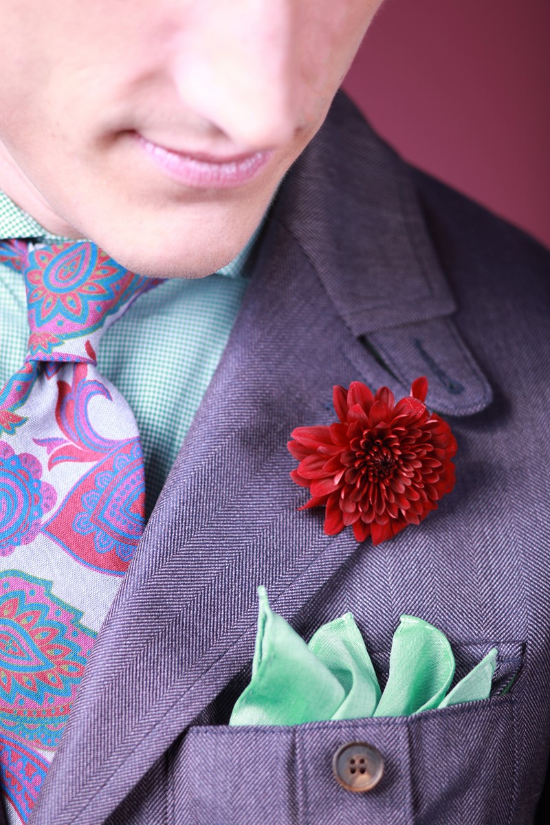 Cravate en coton imprimé de larges motifs Paisley, 89€ – Mouchoir en lin vert d’eau, 40€