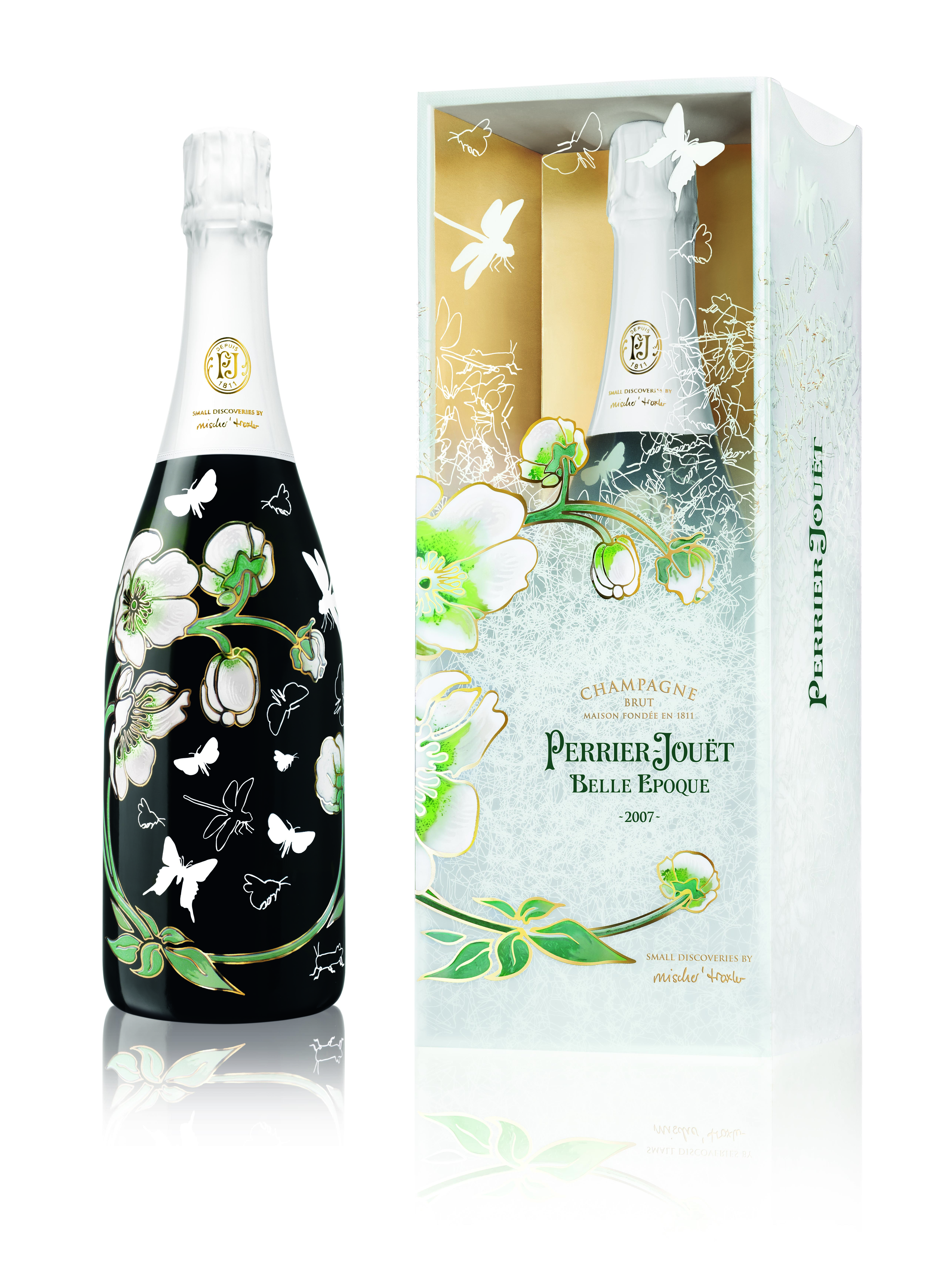 Le duo de designers Katharina Mischer et Thomas Traxler crée en 2014 Perrier-Jouët Ephemerã, une installation présentée au salon international Miami Design. Ephemerã se décline aujourd’hui avec Small Discoveries by Mischer’Traxler, une oeuvre singulière dédiée à la Cuvée Belle Epoque Millésime 2007. Pour créer le motif de cette édition limitée, les Mischer’Traxler ont laissé libre cours à leur imagination tout en respectant le flacon original dessiné par Emile Gallé en 1902. Cet exercice de style a donné naissance à une élégante composition où se mêlent harmonieusement arabesques et feuillages entrelacés de fleurs, de papillons et de libellules. Cette édition limitée restitue fidèlement la vision Art Nouveau de la nature et le caractère floral, racé et ciselé des champagnes Perrier-Jouët.