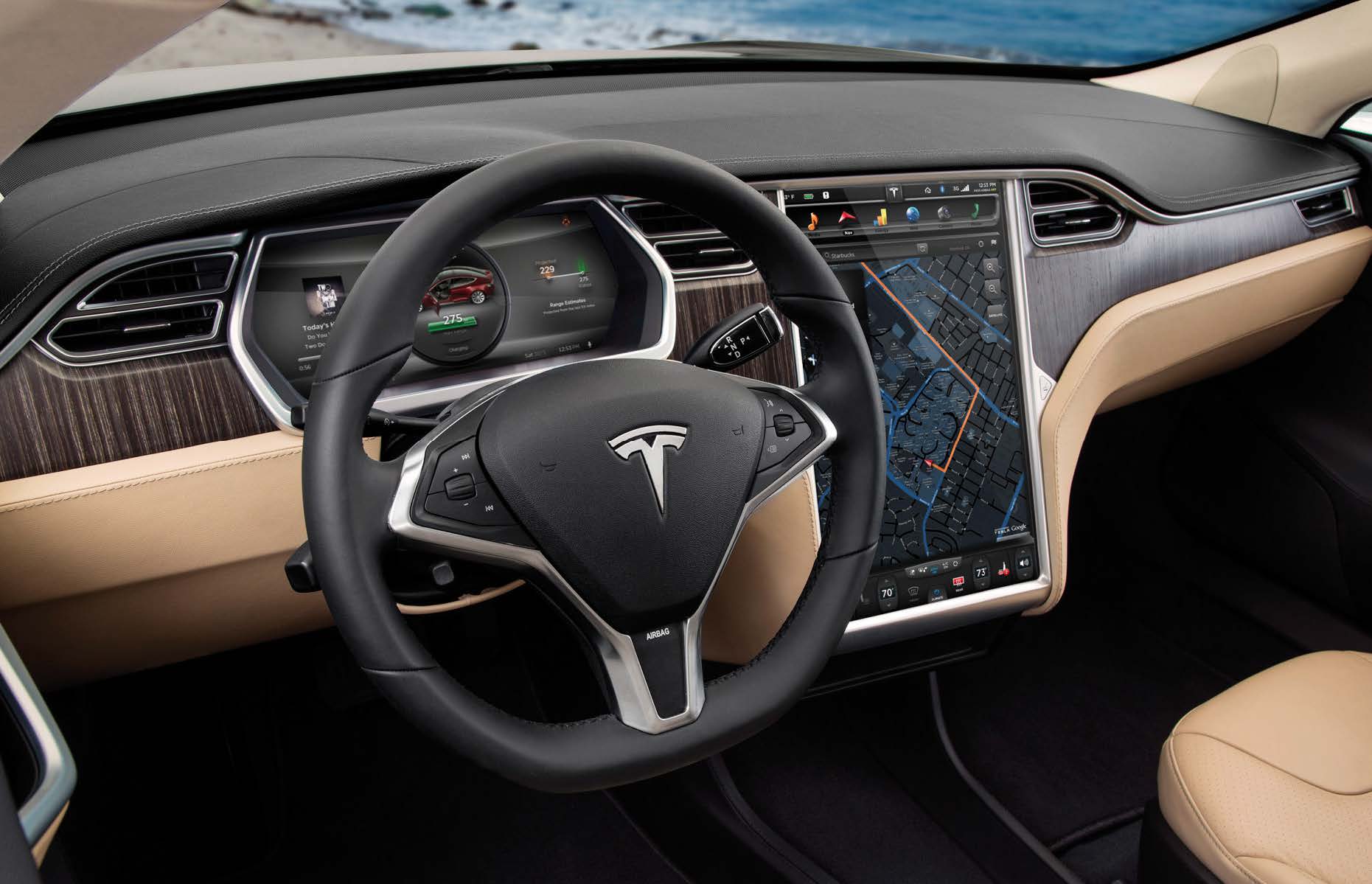 Mais les surprises ne sont pas finies. Par exemple, les poignées de portes sortent automatiquement lorsqu’on les effleure. Et, à l’intérieur, toutes les références automobiles « classiques » volent en éclats. Comme l’explique Elon Musk, cofondateur de Tesla Motors : « En naissant dans un environnement industriel comme celui de la Silicon Valley, la S devait innover en matière d’interface homme-machine ». Ainsi tous les cadrans, jauges et autres contacteurs ont disparu du tableau de bord. Ils sont remplacés par deux écrans. Celui de la console centrale, placé dans le sens de la hauteur, mesure 42 cm de diagonale. Plus que la plupart de nos téléviseurs ! Cette méga tablette tactile affiche et commande la majorité des fonctions de la voiture : climatisation, navigation, réglages châssis (direction, suspension), connexion Internet, paramètres moteur et installation audio. Dans ce cas, il s’agit d’un système à 12 haut-parleurs d’une puissance de 580 W, développé avec les laboratoires Dolby, un autre voisin… Derrière le volant se trouve un écran plus modeste. Il affiche en son centre le tachymètre, la consommation ou la récupération d’énergie, et l’autonomie. L’espace de part et d’autre de ce compteur virtuel peut être paramétré selon les désirs de l’utilisateur. Il n’y a pas de clé de contact ni de bouton de démarrage : il suffit d’appuyer sur le frein et de passer le sélecteur de vitesse sur R ou D pour que ce vaisseau spatial prenne son envol.