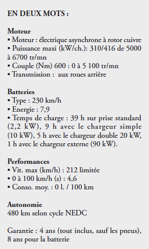 Évidemment, l’énorme capacité de la batterie se paye à plusieurs niveaux. Le poids tout d’abord : avec 480 kg de batterie, la voiture affiche 2106 kg au total – une paille ! Cela dit, son centre de gravité très bas (43 cm) et les suspensions actives lui confèrent un comportement surprenant d’efficacité à défaut d’être réellement sportif.